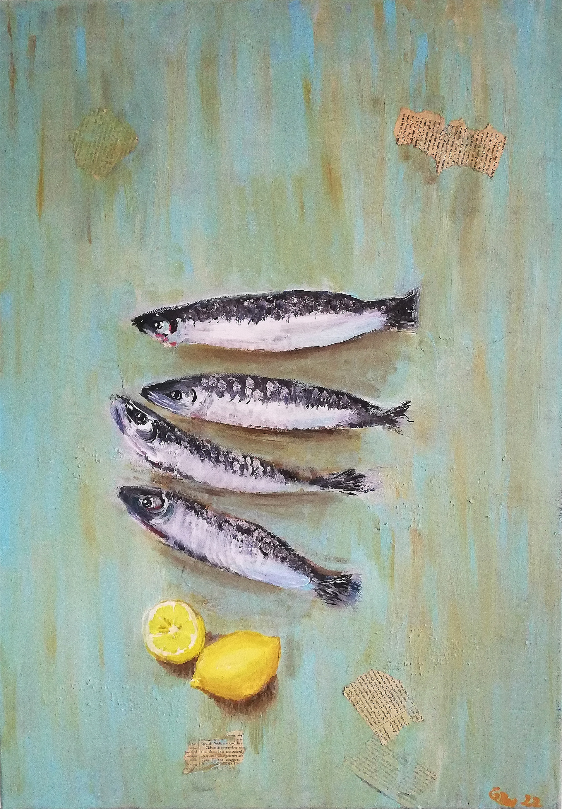 "Heringe mit Zitronen" 50x70 cm Acryl/Mix Technik 2022 360€